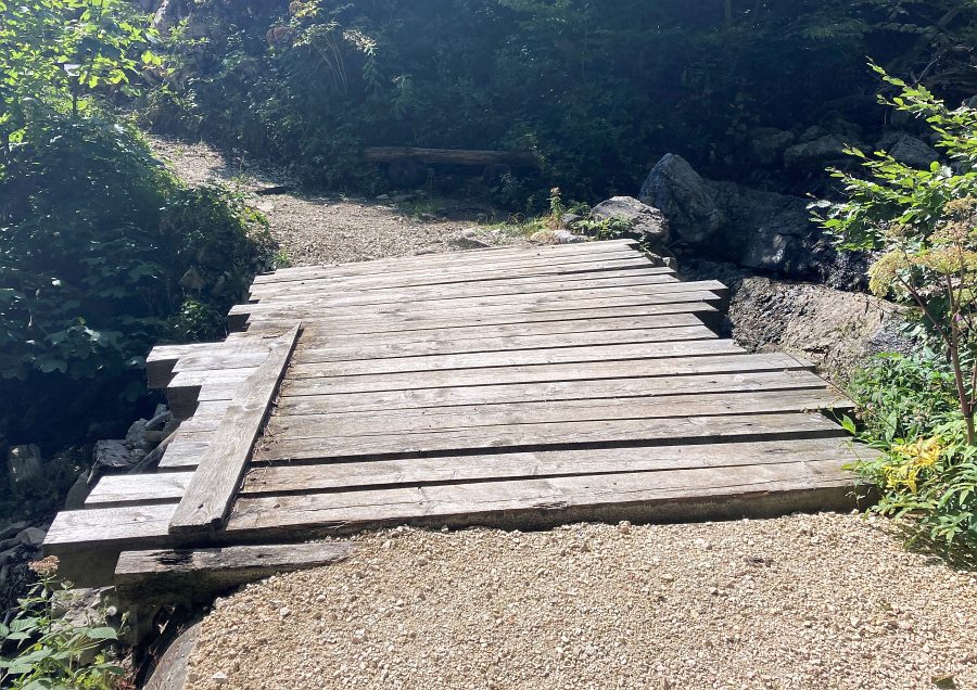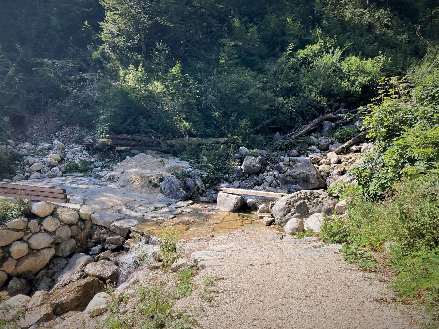 Wir kommen bei unserer Runde am oberen (kostenlosen) Parkplatz Innerwald vorbei und nehmen die zunächst noch breite Forststraße hoch Richtung Brandelberg - noch ist die Steigung moderat, doch schon bald verzweigt sich die Straße und der linke Ast begrüßt uns mit deutlich steileren Abschnitten. Wir kommen an einer alten, baufälligen und stillgelegten Brücke vorbei, hier wurde die neue Straße vorbei in der Fels gehauen.