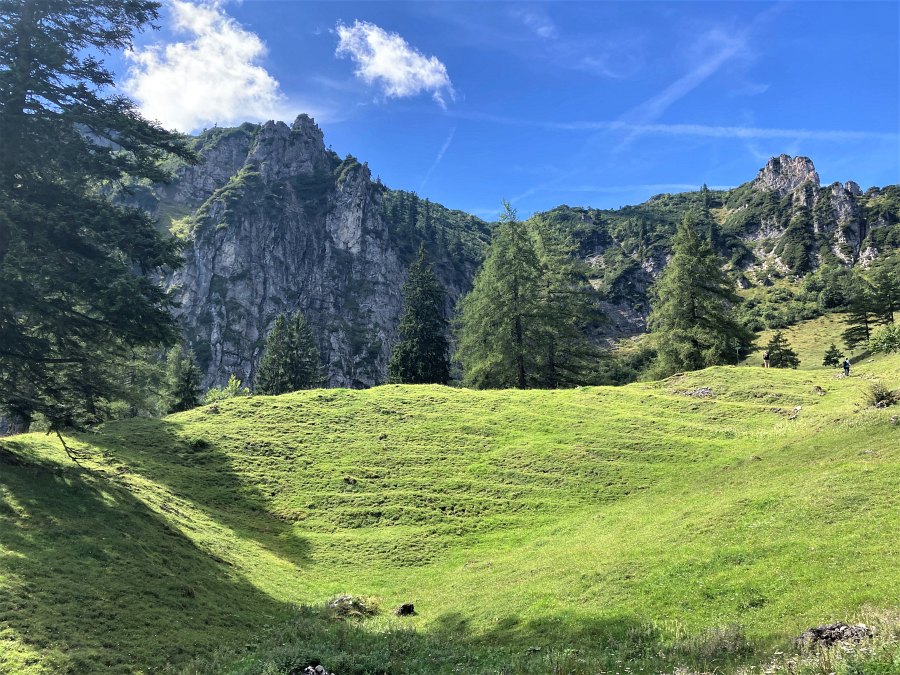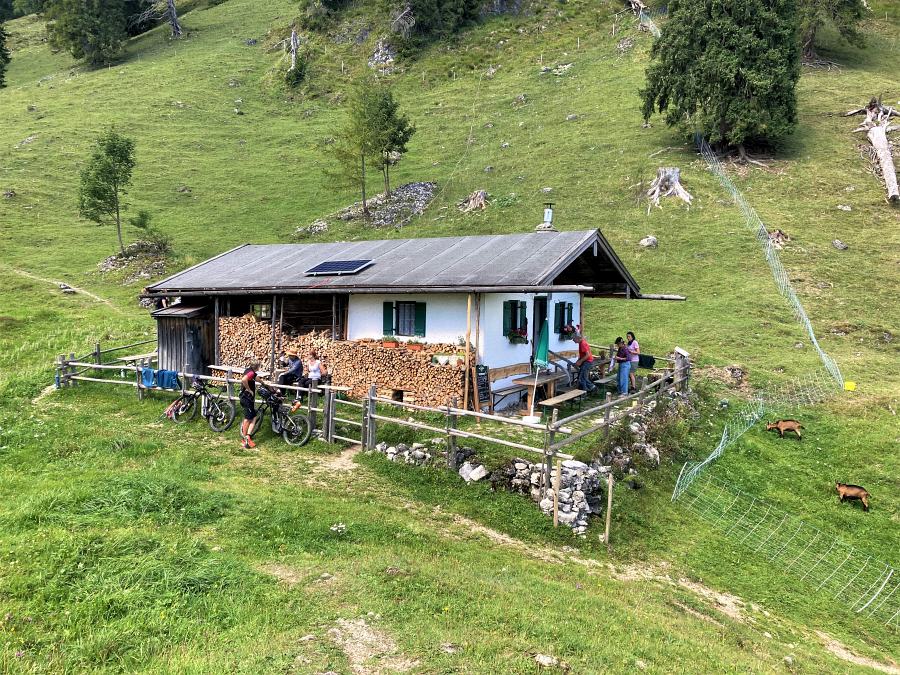 An der Alm werden wir mit einem wunderschönen alpenländischen Dreiklang (zwei Mädl und ein Bua mit Gitarre - zwei davon deutlich Ü60) begrüßt. Bei einer kernigen Brotzeit erfahren wir, daß die "Staatsalm" neu verpachtet ist und abwechselnd von mehreren Personen betreut wird - das Allradfahrzeug für die Versorgung der Almhütte steht unten an der Furt - von hier aus wird alles jeden Tag hoch bzw. runtergetragen...