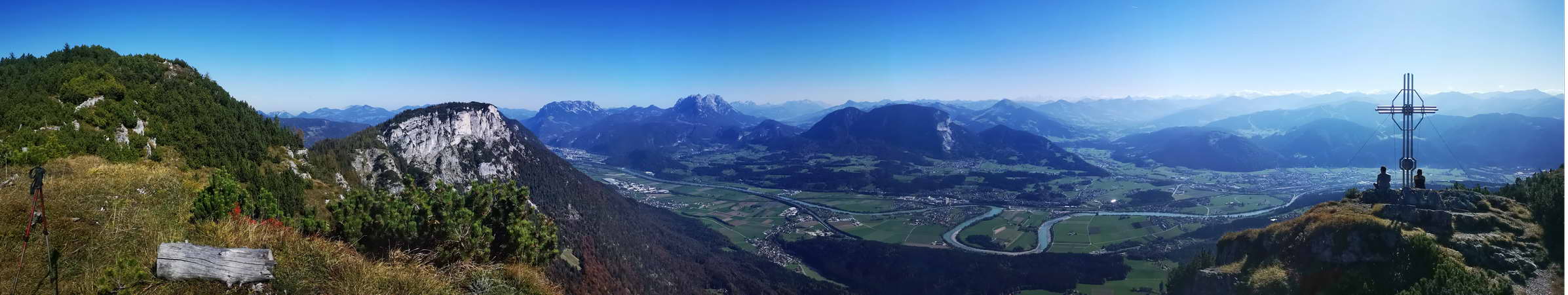 Panoramablick vom Gipfel des Hundalmjoch. Ganz links der nördliche Teil des Gipfels, daneben das Köglhörndl. Mitte links das Kaisergebirge, Mitte rechts der Pölven