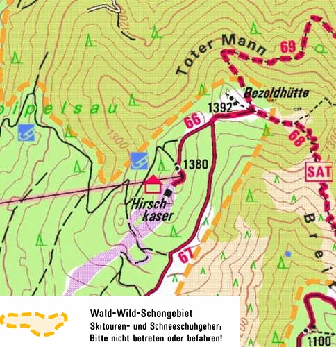 Der Bereich nördlich der Bezoldhütte zum Toten Mann (Weg Nr. 69) führt in ein Wald-Wild-Schongebiet und soll im Winter nicht betreten werden. Siehe Bild.