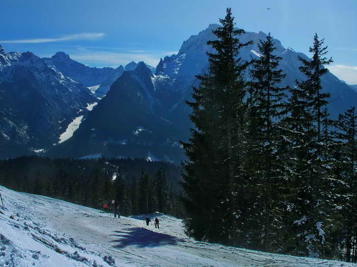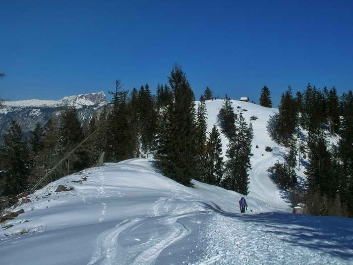 Gegenüber vom Parkplatz betreten wir die Forststraße mit Wegweiser. Auf dieser bleiben ostwärts auf der Forststraße, bis sie bald eine Rechtskurve macht. Bei der nächsten Gabelung halten wir uns links und steigen weiter bergauf, bis wir in die Nähe der Bergstation des Lifts gelangen. Dort ist es auch nicht mehr weit zur Berggaststätte (bei der Gabelung links) und noch ein Stück weiter nördlich zur Bezoldhütte (bei der Gabelung rechts). Diese ist zwar nicht bewirtschaftet, besitzt aber eine Sitzgelegenheit und lädt bei guter Fernsicht zum Blick auf Watzmann und Hochkalter ein.
