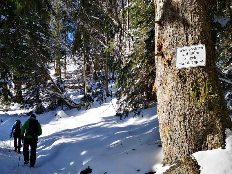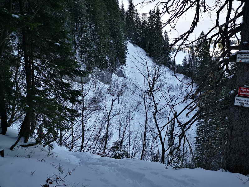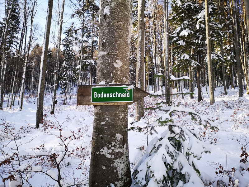 Vom Bodenschneidhaus führen mehrere Wege in unterschiedliche Richtungen – nach Westen, Süden und Osten. Wir entscheiden uns für den meist gespurten Weg Nr. 627, der zunächst leicht ansteigend nach Süden verläuft. Noch vor dem Waldrand biegt der Pfad nach links ab und führt weiter bergauf, wobei ein links abfallender Hang gequert wird – an dieser Stelle leisten Grödel und Wanderstöcke wertvolle Dienste, besonders bei festgetretenem Schnee oder Eis.