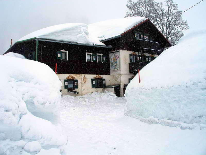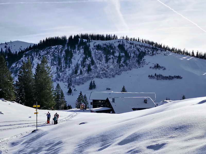Durch den verschneiten Wald erreichen wir nach etwa 1,2 Kilometern eine Wegegabelung, den höchsten Punkt unserer Wanderung. Hier halten wir uns im Abstieg links (östliche Richtung) und gelangen bald auf den Sattel oberhalb der Oberen Firstalm. Von dort sind es nur noch wenige Minuten bis zur bereits sichtbaren Alm.
