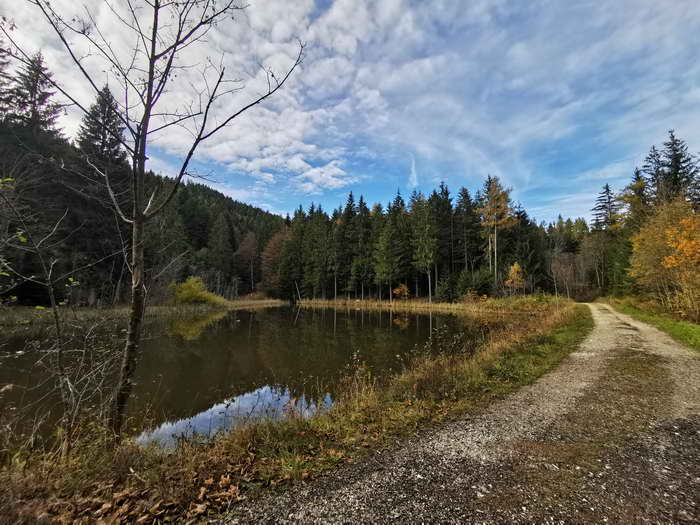 Vom Parkplatz aus überqueren wir die Staatsstraße und richten uns hier gleich auf den rechts abzweigenden Weg, entsprechend dem Wegweiser "Molberting, Hammer, Zinnkopf". Der breite Weg führt zuerst durch lichten Wald und nur flach ansteigend an einigen Häusern vorbei. Achtung: Es gibt mehrere Fahrrad-Wegweiser, denen wir nicht immer folgen dürfen, da es sich teilweise um Umwege handelt sowie um Strecken, die nicht zum Gipfel führen.