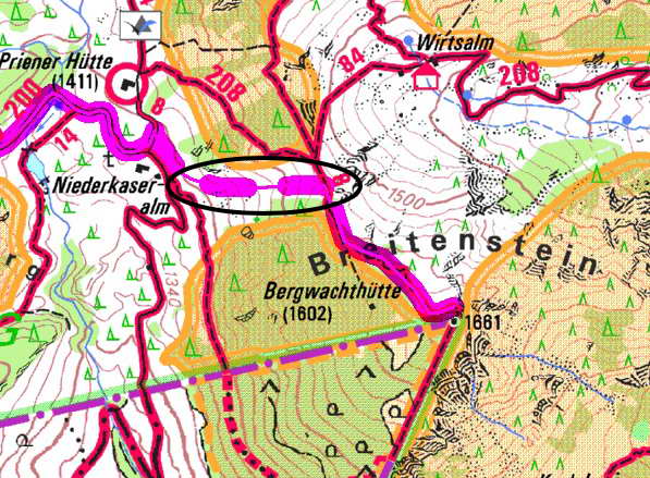 Die freie Mulde vor dem Grat zwischen Geigel- und Breitenstein sollte auf keinen Fall nach links oder rechts verlassen werden, denn auf beiden Seiten befinden sich Schutzgebiete (siehe unten Ausschnitt aus der Alpenvereinskarte BY17).