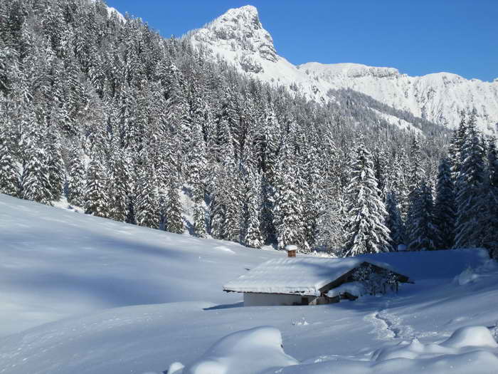 Mordaualm - das klingt nach Mord und Verbrechen. Angeblich soll es hier 1382 einen Mord an einer Sennerin gegeben haben, aber das gehört vielleicht ins Reich der Sagen. So schrecklich der Name der Alm auch klingt - so friedlich ist die Landschaft, und so einfach ist auch der Anstieg. Dieser ist so leicht, kurz und flach, dass er auch von Ski- oder Schneeschuh-Anfängern begangen werden kann. Einziges Handicap: Die drei Almkaser sind nur im Sommer geöffnet. Dafür entschädigt der Blick insbesondere auch das gegenüber liegende Hochkalter-Massiv mit seinem Blaueis-Gletscher. Dieser ist nicht nur der nördlichste Gletscher Deutschlands, sondern überhaupt der ganzen Alpen.
