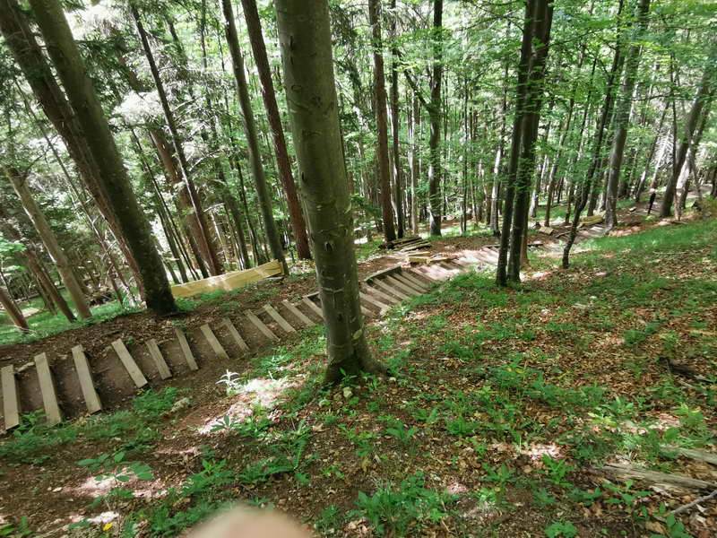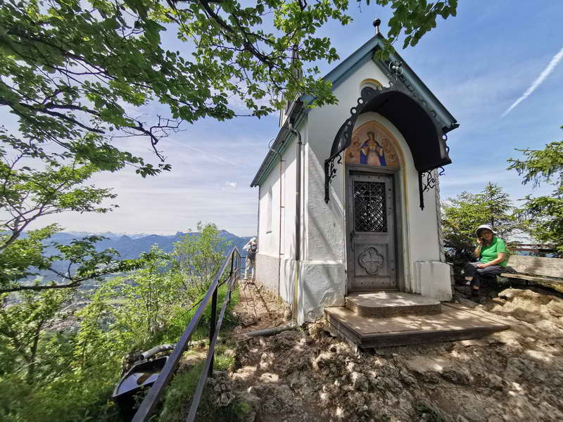 Mit diesem Weg befinden wir uns auch schon auf dem Kreuzweg mit seinen 550 Stufen und 14 Gedenktafeln. Die Holzstufen bringen uns moderat ansteigend bis zur Riedersteinkapelle, die mit einem schönen Blick auf den Tegernsee aufwartet und schon von der Berggaststätte aus sichtbar war.