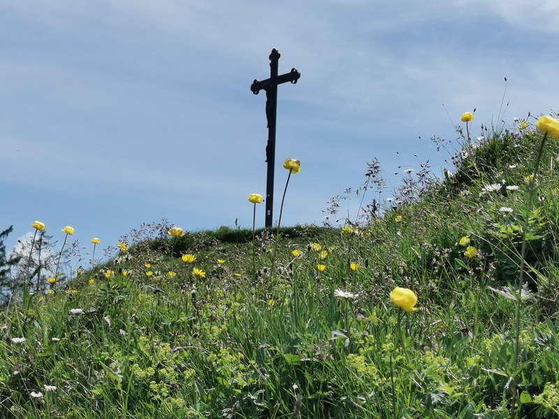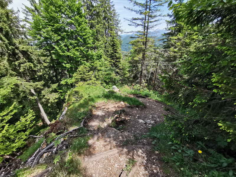 Anschließend gehen wir kurz zurück, um bei der vorangegangenen Gabelung nun geradeaus weiter zu gehen. Diesem Weg, gelegentlich etwas schmal, folgen wir nun durch den Wald, bis sich das Gelände lichtet und wir den Gipfel vor uns erblicken. Der Schlussanstieg ist gleich geschafft, und unterhalb des Gipfelkreuzes gibt es einige einfache Sitzgelegenheiten mit Blick auf den Schliersee und Tegernsee mit ihren umliegenden Bergen.