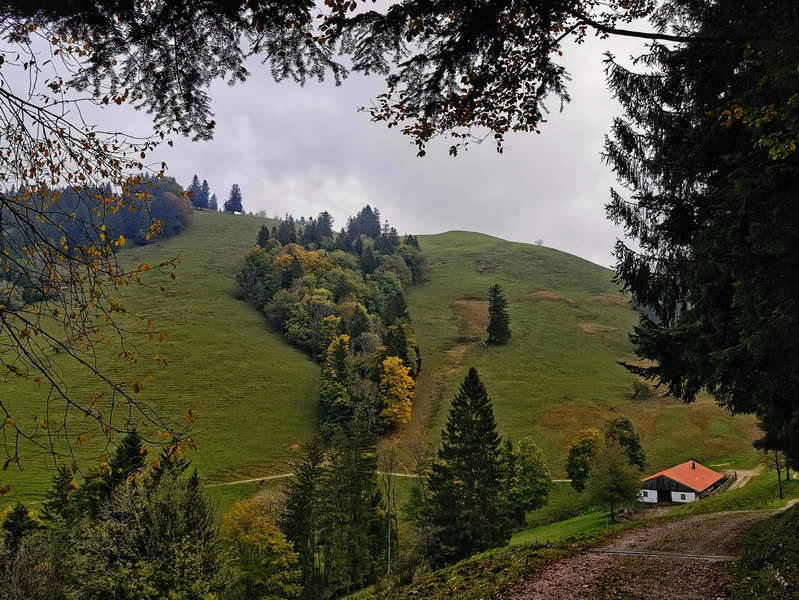 Die breiten Massen zieht es auf den südlich aufsteigenden Forstweg in Richtung Kampenwand. Unser Weg führt jedoch nach Nordosten, wir folgen der Straße, entsprechend dem Wegweiser "Herrenalm, Lindlalm". Vorbei an einem schönen Gehöft stoßen wir nach einem halben Kilometer auf eine Wegegabelung, an der wir uns links halten (Wegweiser Herren Alm, Lindl Alm) und erst einmal leicht bergab entlang des Moosbachs wandern. Die Abzweigung links zur Wolfsschlucht lassen wir links liegen. Nach einem erneuten Aufstieg, bei einer Wegegabelung auf 880 m, gehen wir rechts oberhalb der Herrenalm weiter und erreichen nach leichtem Anstieg eine weitere Kreuzung. Dort wenden wir nach links auf die bereits sichtbare Graskuppe des Reifenberges zu. Der zeitweise asphaltierte Wanderweg führt in 10 Minuten zur nicht bewirtschafteten Lindl Alm in der Nähe des Gipfels. Hier bieten sich mehrere Sitzgelegenheiten an. Wer den Gipfel mitnehmen will, wandert in wenigen Minuten ohne viel Höhengewinn auf die baumlose Hochfläche.
