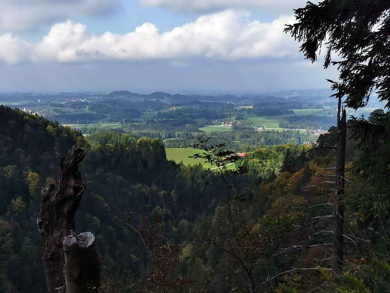 Der Rückweg beginnt einige Meter unter der Lindlalm. Während der Hauptweg geradeaus auf dem Höhenweg zum GH Adersberg führt, steigen wir links in den schmalen Pfad ein (Wegweiser: Bernau, Wolfsschlucht über Stachl). Der schöne, schattige Steig leitet uns stetig leicht bergab durch Mischwald entlang des Reifenberg-Nordhangs. Nach Regentagen kann er stellenweise batzig sein. Ca. 20 - 30 Minuten später mündet er in den Verbindungsweg zwischen Bernau und Herrnalm. Hier befinden wir uns bei dem Wegpunkt "Stachl am Brand". Wie ein Schild informiert, stand hier bis 1877 der Hof einer Waldarbeiterfamilie. Außer einer stark überwachsenen Steinmauer, bei der es sich um den Keller oder Eingang zum Keller handelt, ist von dem Gebäude nichts mehr zu sehen. Gegenüber kann man noch eine Wasserzisterne entdecken. Wir biegen links ein und gelangen bald zur Herrenalm. Ihren Namen hat sie vom ehemaligen Eigentümer Kloster Herrenchiemsee, 1803 wurde die Alm vom Staat gekauft.. Bei ihr halten wir uns recht und steigen einige Meter bergauf, um schließlich am Scheitelpunkt wieder auf unseren Aufstiegsweg zu treffen. Über diesen gelangen wir in 30 Minuten zurück zum Wanderparkplatz Hintergschwendt.