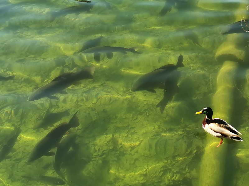 Gleich am Parkplatz überqueren wir über eine schmale Holzbrücke den Kieferbach (Wegweiser: Hechtsee 5 Minuten). Gleich nach der Brücke klärt uns ein großes Schild über den Abfluss des Hechtsees auf, den uns die nächsten Minuten beim Aufstieg über die Holzstufen begleitet. Der Gestank, den wir hier bemerken, stammt nicht von unserem Vordermann, sondern von dem schwefelwasserstoffreichen Abfluss mit seinem Wasserfall. Dieser ist auch für die Ökologie des Sees wichtig, denn das Wasser wird aus 20 m Tiefe aus dem Seegrund nach oben gepumpt und hierher geleitet. Nach wenigen Minuten stehen wir bereits vor dem malerischen Hechtsee, dem größten der Thierberger Seen. Mit etwas Glück können wir der kleinen Brücke am Seeufer Schleien und Heche entdecken.