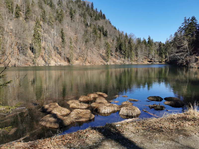 Anschließend steigen wir nach Süden bis zum Gasthof Neuhaus ab. Dort geht es links weiter, leider auf einer Asphaltstraße, wenn auch sehr wenig befahren. Wir bleiben auf ihr die nächsten 1,2 Kilometer. Hinter den Gebäuden von Aigen geht es in den Wald und von dort schattig bergab bis zum Hechtsee. Über den Gasthof und das Ostufer führt der breite Wanderweg zurück zum Abfluss und Abstieg zum Wanderparkplatz.