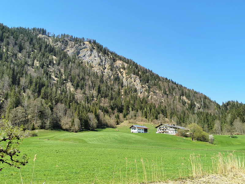 Unsere Tour startet an der Talstation der Bergbahn Hocheck. Zunächst müssen wir wenige Minuten durch den Ort fahren: Dazu fahren wir auf der Carl-Hagen-Straße (Parkplatz) einige Meter zurück und biegen rechts in die Schützenstraße ein, kurz darauf in die Sankt-Josef-Spital-Straße, auf der wir bis zur großen Kreuzung bei der Gemeinde gelangen. Dort biegen wir rechts in den Oberfeldweg ein und bleiben auf diesem bis zur Einmündung in die Kufsteiner Straße. Hier rechts halten. Nach 400 Metern biegen wir rechts in die Seestraße ein. Nun verlassen wir den Ort Richtung Luegsteinsee.