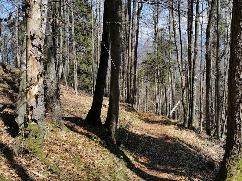 Die nächsten 150 Höhenmeter fahren wir auf dem bekannten Wanderweg (im Winter Rodelbahn) durch den Wald dem Brünnstein entgegen. Dort, wo wir den Wald verlassen, entdecken wir über uns die Gebäude der Rechenau, auf die wir auch zufahren. Zwischen den Gebäuden halten wir uns rechts (also genau nach Norden) und gelangen nach einem halben Kilometer zu dem Weiler Wildgrub. Nach der Kapelle biegen wir rechts ab. Nun können wir den richtigen Weg kaum mehr verfehlen. Bei der nächsten Verzweigung auf 950 m halten wir uns rechts und plagen uns die nächsten 500 Meter bis zu einer Linkskehre auf, der breite Forstweg wendet sich hier nach Norden Richtung Gipfel. Auf 1170 m biegt der Weg scharf rechts ab - die Wegbeschaffenheit wieder nun steiniger, aber flacher. Das Bike muss die nächste Viertelstunde entlang eines Wanderpfades durch den Wald immer wieder getragen werden. Am Ende der Tragestrecke kann man das Bike etwas verdeckt absperren und zu Fuß dem kurzen Wanderpfad Richtung Gipfel Schwarzenberg folgen. Hierzu müssen wir gut aufpassen, um nicht den Steig nach rechts zu verpassen. Dieser ist nur durch einen blauen Farbklecks auf einem Stein markiert, wenige Meter danach gibt es nochmals eine kleine Markierung. Spätestens hier Bikedepot. Auf dem weichen Waldweg erreichen wir nach wenigen Minuten den Gipfel. Dieser ist stark bewachsen, nur zum Brünnstein und Traithen ist eine einigermaßen freie Aussicht möglich.