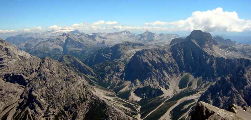 Der Gipfelblick ist einmalig: im Osten hinter dem Watzmann der Hohe Göll und das Hagengebirge, im Südosten der Hochkönig mit der Übergossenen Alm, das Steinerne Meer mit Schönfeldspitze und Großem Hundstod, im Süden die Tauern mit Großglockner und Großvenediger, davor mit dem Hochkalter durch einen Grat verbunden die Hocheisspitze, im Westen die Reiteralpe mit Mühlsturzhorn, im Norden das Lattengebirge. Und natürlich die Szenerie um den Blaueiskessel (Blaueisgletscher, Blaueisspitze, Blaueishütte und Hintersee).
