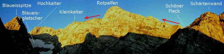 Ab der Hütte auf dem beschilderten Weg Richtung Hochkalter. Zuerst kurz nach Süden, nach einigen Minuten bei den großen Blöcken der Abzweigung Richtung Hochkalter folgen. Es geht steil auf dem gut bezeichneten Steig durch eine Schuttrinne zum "Schönfleck" (Schönen Fleck") hinauf; wobei man die letzten 20 Meter zur Scharte leicht klettern muss (I-II). Hier hat man erstmals einen schönen Blick auf Reiter Alpe, Loferer Steinberge und dahinter die Venediger-Gruppe. Der weiterführende Weg ist meist Gehgelände mit einigen kleinen, aber leichten Kletterstellen (einmal UIAA II, ansonsten I). Über den meist breiten Kamm überschreitet man den Rotpalfen und Kleinkalter.