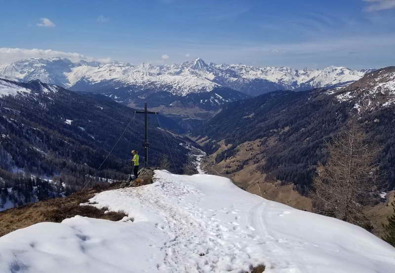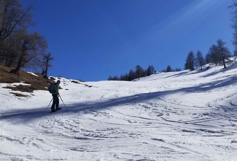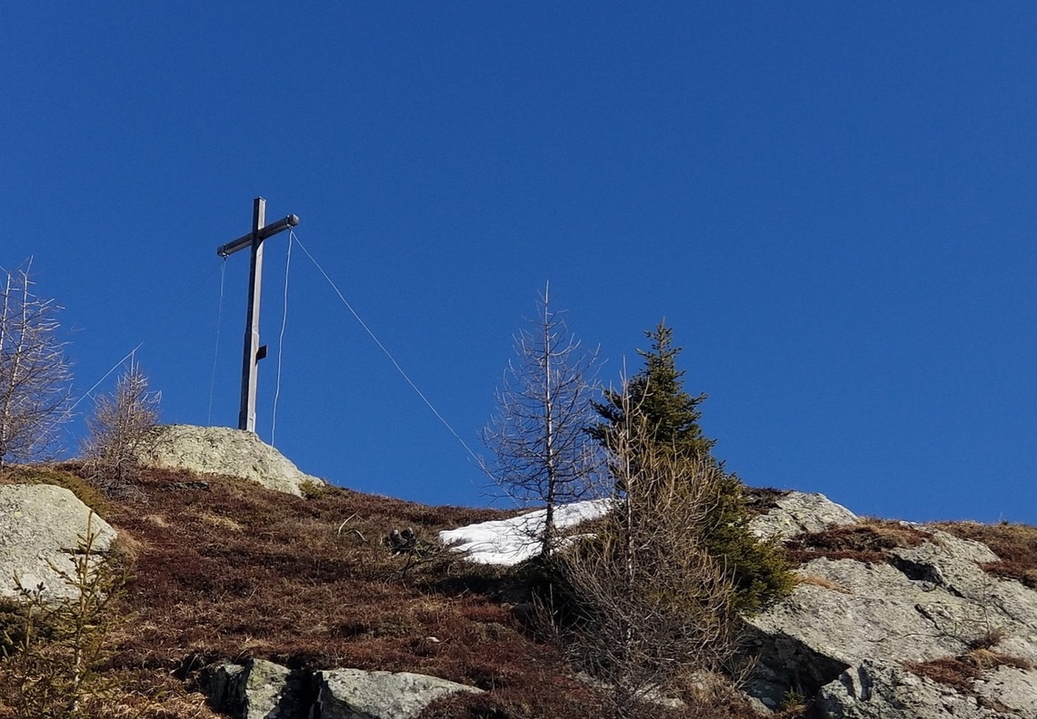 Direkt am Abzweig zur Holzeben-Siedlung in Schmirn weist ein Zaundurchschlupf und ein LVS-Checkpoint den Startpunkt der Tour aus. Wir stapfen – ganz leicht links haltend – eine weitläufige Wiese hinauf und treffen auf den von Holzeben heraufziehenden Forstweg. Er wird nur überquert, den weiteren Aufstieg gibt eine markante Waldschneise vor (SO). Zunehmend steil, aber dank Kuppen und Wellen noch gut machbar, leitet der Hang hinauf zu einem zweiten querenden Forstweg. Auch er wird lediglich gekreuzt. Für einige Meter kann man jetzt noch einer deutlichen Trasse links des Bachs folgen (=Aufstiegsspur zum Hohen Napf); sobald sich linker Hand aber eine breite Waldschneise öffnet, schwenkt man dorthinein ein (O). Sie gibt mittelsteil und mit viel Platz für die persönliche Lieblingsspur für ein längeres Stück die Route vor. Schließlich öffnet sich die Schneise zu einer weitläufigen Wiese, rot-weiße Markierungspflöcke helfen beim Beibehalten der Richtung (O). Wo die Wiese an einem Waldgürtel endet, leitet ein rot-weiß markierter Zaundurchschlupf in lichten Lärchenwald, der in einigen gut markierten Kehren zügig überwunden wird. Nun öffnet sich das Gelände endgültig, direkt voraus ist bereits der Gipfelaufbau zu sehen. Zunächst steigt man im Wiesengelände noch – leicht rechts haltend - nach SO auf, quert dann aber – jeweils das bequemste Gelände nutzend – unter dem Gipfelaufbau hindurch nach rechts (S). Direkt unterhalb der Gipfelfelsen umrundet man ein steiles Eck und gelangt so in die Westflanke des Rauhen Kopfs. Steil, aber meist gut gangbar arbeitet man sich über ganz enge Serpentinen zu einem kleinen Sattel empor. Von dort führt eine steile, aber nur kurze Steigspur zum aussichtsreichen Gipfel.