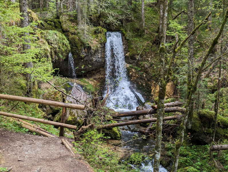 Um andererseits über den leichten Rossstein-Klettersteig abzusteigen (Klettersteigset für Geübte nicht erforderlich), gehen wir zunächst von der Hütte einige Meter Richtung Rossstein und wenden uns dann links in den Steig. Dieser ist rechtsanspruchsvoll: sehr steil, schmal und an den relevanten Stellen von den vielen Besuchern arg glattgeschliffen - Absturzgefahr! Schließlich erreichen wir mit dem Sonnbergalm-Hochleger flacheres Gelände. Von dort geht es 300 Höhenmeter hinab zum Sonnbergalm-Niederleger und von diesem in vielen, kleinen Serpentinen durch den Wald bis zum Wanderparkplatz Bayerwald. Um zu unserem Ausgangspunkt, dem drei Kilometer entfernten Startpunkt am Klamm-Parkplatz zu gelangen, geht man eine halbe Stunde entlang der B307 oder nimmt die direkte Busverbindung, die allerdings nur wenige Male täglich fährt. Info: Oberbayernbus, Linie 9556 und andere.