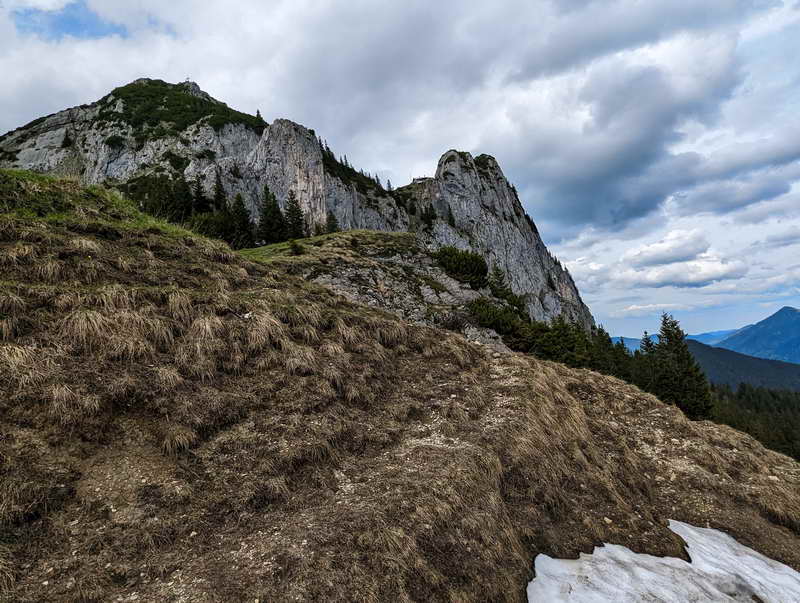 Um wieder zurück ins Weißachtal zu gelangen, können wir zwischen einer schweren und leichten Variante wählen. Für die leichtere Variante steigen wir auf dem steilen Nordabstieg zurück bis zu der erwähnten Wegegabelung - hier kamen wir zuvor von rechts hoch, nun gehen wir geradeaus, also westlich, weiter und bleiben auf dem sog. Altweibersteig. Dieser führt über einen großen Bogen um den Rossstein herum und anschließend hinunter zum Sonnbergalm-Hochleger.