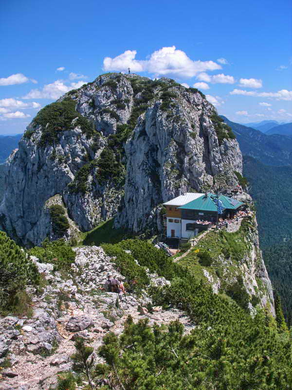 Kaum eine andere Berghütte klebt so beeindruckend in schwindelnder Höhe zwischen zwei Gipfeln wie die Tegernseer Hütte. Für viele bayerische Bergfreunde gehört dieser Aussichtsbalkon in der Scharte zwischen Roß- und Buchstein zu den Zielen, die man mindestens einmal erreicht haben muss. Da wir eine Rundwanderung machen, erfolgt unser Aufstieg durch eine romantische Klamm und weiter über die Nordseite zur Hütte. Von dieser aus kann dann der Gipfel des Roßstein unschwierig erreicht werden, während die Rinne auf den felsigen Buchsteingipfel schon als leichtes Klettergelände bezeichnet werden kann und nur den Schwindelfreien beibehalten bleibt. Auf der sonnigen Terrasse können die weniger Mutigen ihren Freunden dann zusehen, wie sie sich in wenigen Minuten zu seinem Gipfelkreuz emporarbeiten. Für den Abstieg nach Bayerwald gibt es eine schwere und etwas leichtere Variante.