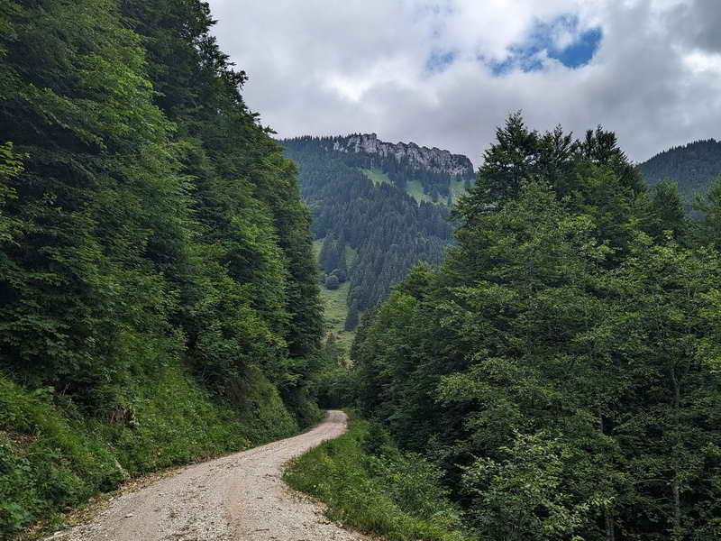 Von einem der hintereinander liegenden Parkplätze folgen (wandern oder fahren) wir dem Wegweiser in das Dalsenbachtal. Den ersten Abzweig zur Steinbergalm beachten wir nicht, sofern wir mit dem Mountainbike unterwegs sind. Als Wanderer können wir hier etwas abkürzen, also rechts halten. Ansonsten bleiben wir auf dem Hauptweg, bis nach insgesamt 2,7 km rechts eine Schotterstraße abzweigt. Diese führt uns nun in mehreren Serpentinen hinauf bis zur Steinbergalm.
