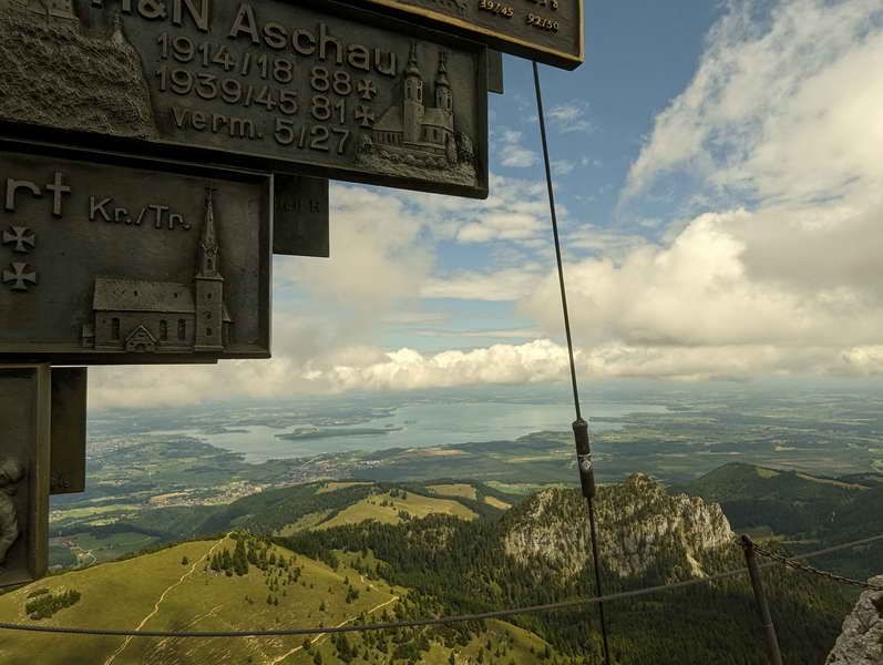 Hinter dem obersten Almgebäude verweist ein Schild zur Kampenwand. Die Zeitangabe von 40 Minuten bezieht sich allerdings auf die Bergstation der Kampenwandbahn. Der Steig ist stellenweise schmal und dicht zugewachsen. Nach einer halben Stunde verzweigt sich der Weg. Links führt der Steig weiter zur Bergstation. Wir halten uns jedoch rechts und befinden uns nun auf dem südlichen Panoramaweg. Dieser führt uns den nächsten Kilometer, zunächst nur mäßig ansteigend, unterhalb der Südwände bis zu einer Wegegabelung. Rechts führt der Weg hinunter zur Piesenhausener Hochalm. Wir halten uns links, schon bald wird es steiler und wir erreichen felsiges Gelände. Zwei kleine Steilstufen sind durch Latschenbügeln zu besteigen. Die Stellen sind nicht exponiert. Das anschließende Wegstück ist drahtseilgesichert und schmal, aber unspektakulär. Dann erblicken wir auch schon in geringer Entfernung das große Chiemgaukreuz.