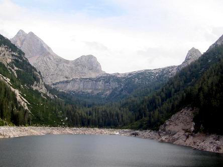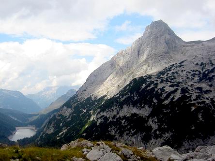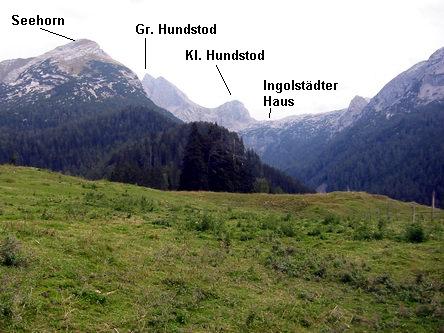 Rechts neben dem Stausee zuerst steil nach oben, dann wieder weit nach unten und nach einer nochmaligen Erhebung in das romantische Gelände des Dießbachs bis vor die Mitterkaserwand. Vor ihr verläuft der Steig links nach oben bis zu einer Gabelung, wo man den rechten Weg einschlägt (links geht es zum Seehorn). Nun leicht auf die Mitterkaserwand, durch Latschen und auf steinigem aber gutem Weg, meist an der Materialseilbahn entlang bis zum Ingolstädter Haus.