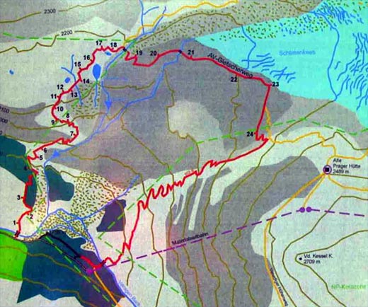 Ab hier beginnt der gut markierte Gletscherweg (Lehrpfad). Er wurde im Jahr 1978 als erste Maßnahme im Zuge der Planung des Nationalparks Hohe Tauern durch den Österreichischen Alpenverein eingerichtet. Die Nummern der 24 Haltepunkte sind in Stein gemeißelt. Auf Schautafeln entlang des Gletscherweges wurde bewusst verzichtet.