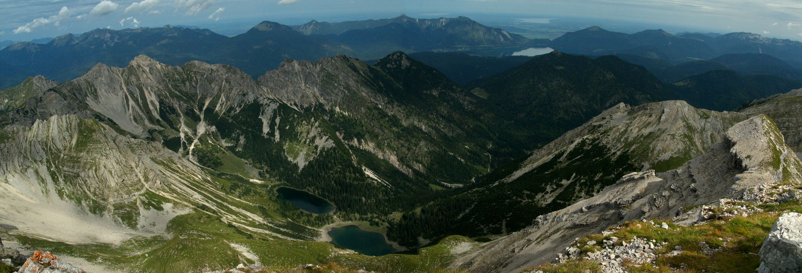 Blick von der Soiernspitze auf die Soiernseen und den Soiernkessel. Im Hintergrund schimmert der Walchensee herüber.