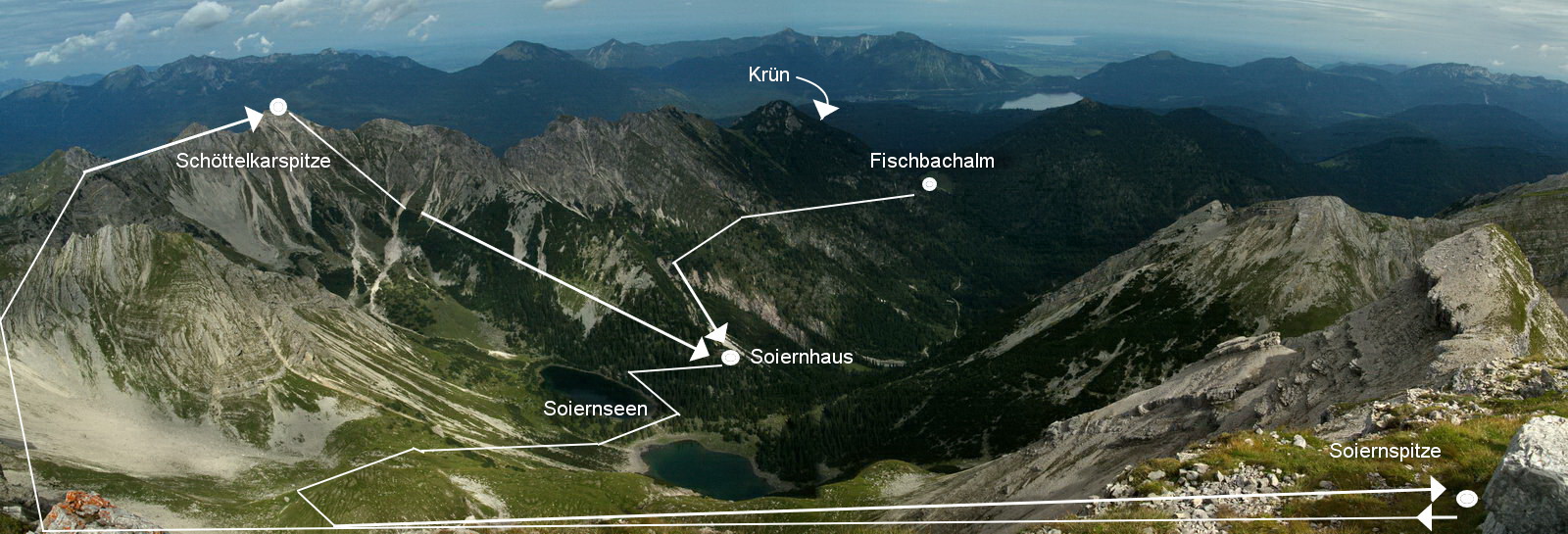 Die kleine Soierngruppe enthält mit der 2257 m hohen Soiernspitze den höchsten Gipfel des Vorkarwendel. Die Gipfel der Soierngruppe sind hufeisenförmig um den Soiernkessel aufgebaut, inmitten des Kessels liegen die beiden Soiernseen und das Soiernhaus. Die Runde um den Kessel (Soiern-Umrahmung) mit Überschreitung diverser Gipfel ist eine brillante Gratwanderung. Allerdings sollte man die Tour aufgrund des langen Zustiegs auf zwei Tage verteilen, eine Übernachtung im geschichtsträchtigen Soiernhaus bietet sich an. Wer sich die Übernachtung sparen will, fährt am besten mit dem Mountainbike bis zur Fischbachalm und erspart dadurch mehrere Stunden im Auf- und Abstieg. Schön ist auch die Anfahrt mit dem Mountainbike über den Soiernweg (siehe Link). Es wird empfohlen, die Umrundung erst ab Juni begehen oder Grödeln mitnehmen, da die steilen Schneefelder in den Gipfelbereichen gefährlich sind. Der Weg vom Soiernhaus direkt auf die Schöttelkarspitze kann auch als Tagestour vorgenommen werden.