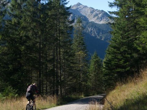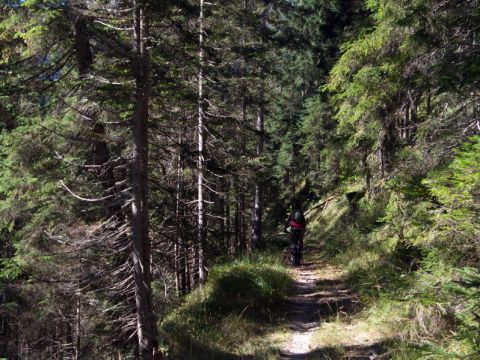Der vorerst höchste Punkt ist ein größerer Platz, wo nach rechts ein Wirtschaftsweg abzweigt. Hier bleiben wir aber auf dem Hauptweg, der links davon leicht bergab führt. Nach einer längeren Abfahrt erreichen wir bei einer Wegekreuzung die Niederbachlalm (Diensthütte). Dort überqueren wir den Bach und folgen links dem Soiernweg und haben wieder einen längeren Anstieg vor uns. Mehr und mehr entwickelt sich der breite Fahrweg zu einem engen Pfad und wird immer schlechter befahrbar. Über Wurzelwerk, Steine und umgestürzte Bäume gelangen wir schließlich zur Schlüsselstelle dieser Tour. Dort müssen mehrmals steile Hangabrutsche gequert werden. Ein Schild weist kurz zuvor darauf hin, vom Rad abzusteigen. Nach dieser Schiebestrecke wird nach einem kleinen Holztor der Weg immer besser, bleibt aber kontinuierlich ansteigend. Schließlich stoßen wir auf 1270 Meter Höhe auf eine Forststraße. Hier befinden wir uns kurz vor dem Hundsstall, das ist der Talgrund unterhalb der Soiernhäuser, den wir in zwei Minuten erreichen könnten. Wir wenden uns jetzt jedoch scharf rechts und gelangen über die Forststraße in einer guten Viertelstunde (130 Höhenmeter) den Scheitelpunkt dieser Tour, die Fischbachalm inmitten grüner Almwiesen auf 1402 m Höhe.