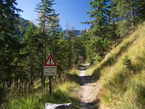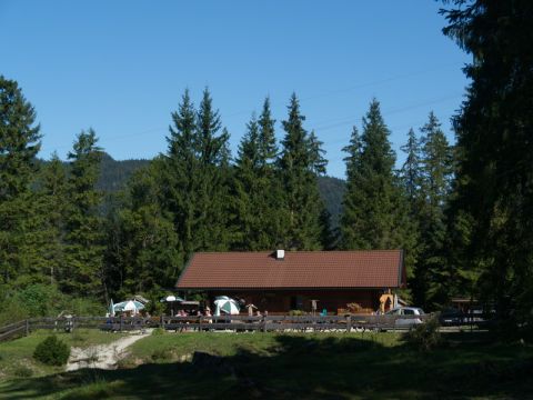 Wer die Tour noch um ca. 2 Stunden ausdehnen will, kann ab hier über den Lakaiensteig zu den Soiernhäusern gehen. Allerdings ist der Steig teilweise schmal und stark abfallend, deshalb nur zu Fuß erreichbar außerdem sollte man bergtaugliches Schuhwerk anhaben. Das obere der beiden Häuser, auch allgemein Soiernhaus genannt, liegt über dem Soiernkessel mit seinen zwei Seen, auf denen angeblich schon König Ludwig II. nachts auf einem Schiff lustwandelte. Direkt vom Haus nach oben hin haben wir einen schönen Blick auf die gebänderte Gipfelpyramide der Soiernspitze. Für den Hin- und Rückweg benötigen wir jeweils 50 Minuten.