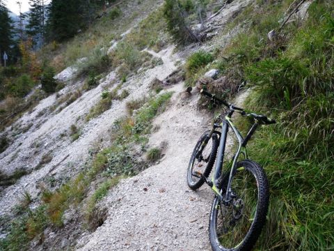 Die Runde um den Hohen Grasberg ist eine beliebte Tour in der Soierngruppe. Sie enthält alles, was eine schöne Mountainbiketour ausmacht: knackige Steigungen, Downhills auf Forststraßen, aber auch einsame Trails mit kurzen Schiebetrecken, faszinierende Ausblicke in die Karwendelkulisse und natürlich gute Einkehrmöglichkeiten. Man kann die Tour sowohl in Krün als auch in Vorderriß starten und jeweils im oder entgegengesetzt vom Uhrzeigersinn befahren. Unsere hier beschriebene Tour beginnt am Zusammenfluss von Isar und Rißbach bei Vorderriß und führt im Uhrzeigersinn zurück zum Ausgangspunkt. Früher konnte man gemächlich direkt am Flussufer in dem wildromantischen Isartal die letzten Kilometer zurücklegen. Heute müssen wir einige zusätzliche Höhenmeter bewältigen, da die Fahrstraße etwas nach oben verlegt wurde und mehrere Anstiege aufweist. Schuld daran ist die Tatsache, dass nach manchem Hochwasser die Isar jeweils einen anderen Verlauf nahm.