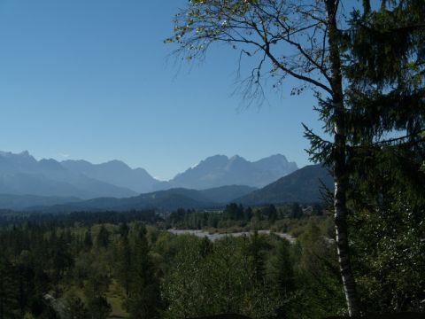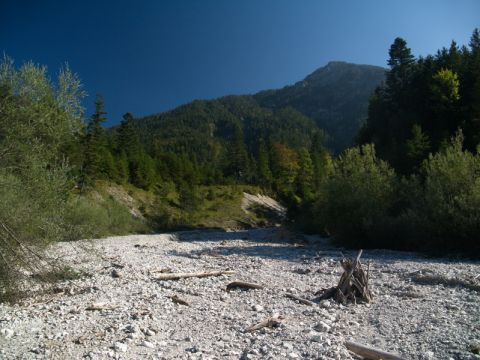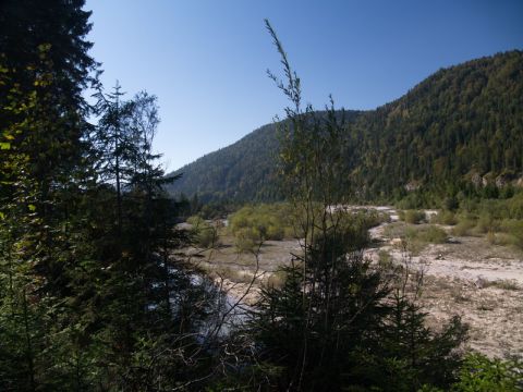 Nachdem wir uns auf der Fischbachalm gestärkt und das schöne Panorama (Pleisenspitze, Estergebirge) genossen haben, beginnt unser langer Downhill. Direkt ab der Hütte führt uns die bequeme Schotterpiste schnell in Richtung Krün. Nach knapp sechs Kilometern, kurz bevor wir das Tal erreichen, verlassen wir bei einer Wegegabelung auf 880 m den Hauptweg und biegen rechts in Richtung Auhütte ab (Schild). Diese erreichen wir nach einer guten Viertelstunde auf breiter Forststraße ohne großen Höhenunterschied. Die Hütte lädt zu einer letzten Kaffeepause ein, anschließend fahren wir hinter der Hütte weiter über den Markgraben Richtung Vorderriß. Wer jedoch meint, nun genüsslich entlang der Isar bis zum Parkplatz zu rollen, hat sich getäuscht: Mehrere Zwischenanstiege liegen noch vor uns, wobei der erste der größte ist. Dafür entschädigt aber die idyllische Kies- und Sandlandschaft, da die Isar sich nach jedem Hochwasser selbst überlassen blieb und ihr Lauf von Menschenhand nie begradigt wurde. Nach einer letzten, kurzen Abfahrt erreichen wir schließlich die Gabelung, bei welcher wir zu Beginn unserer Tour links in den Soiernweg eingebogen waren. Ab hier gelangen wir über die hölzerne Isarbrücke nach wenigen Minuten zurück zu unserem Ausgangspunkt.
