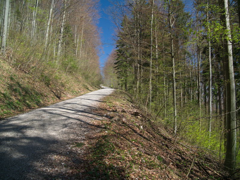 Nach einer Hüttenrast in einem der drei Gebäude mit Blick auf den Hochfellngipfel-Bereich fahren wir auf dem gleichen Weg wieder hinunter bis zu dem Wegedreieck. Hier fahren wir gerade aus weiter in Richtung "Gleichenbergalm, Kohlstatt, Weissachental". Wieder geht es ca. 100 Höhenmeter durch den Wald gehörig bergauf! Nach Verlassen des Waldes befinden wir uns bei der Gleichenbergalm, die während der Sommermonate meist geöffnet hat. Auf dem Sattel der Gleichenbergalm fahren wir nun bergab in das Weissachental. Dort angekommen, fahren wir kurz über eine Brücke, anschließend fahren wir links gleich wieder bergauf in Richtung "Engelstein, Pattenberg". Am Scheitelpunkt auf ca. 920 m Höhe angekommen, fahren wir einige Meter weiter bis zu der Stelle, wo ein schmaler Pfad die Forststraße verlässt (Wegweiser "Pattenberg"). Der Pfad ist schmal und sieht von oben wie ein schwerer Trail aus, doch bereits nach wenigen Metern wird er breiter, flacher und von guter Wegbeschaffenheit. Nach kurzer Zeit auf diesem Traumpfad passieren wir bei einer Lichtung rechts den Aufstieg zum Engelstein (gutes Schuhwerk und Schwindelfreiheit zur Besteigung notwendig!), fahren hier weiter entlang des Nordhanges bergab und verlassen nach einer Abfahrt von 160 Höhenmetern (ab dem Scheitelpunkt) den Wald. Hier lassen wir die linke Wegabzweigung liegen und halten uns rechts weiter bergab, bis wir Pattenberg erreichen. In der Dorfmitte fahren wir auf der Autostraße weiter bergab bis nach Bergen. Hier biegen wir zuerst rechts ab und überqueren dann links vom Gasthof Eisenhammer die Weiße Achen. Nach weiteren 150 Metern halten wir uns rechts und befinden uns wieder vor dem Parkplatz der Hochfellnbahn.