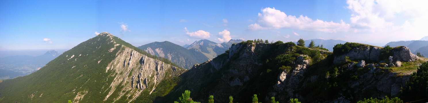 Vor uns öffnet sich eine beeindruckender Kessel mit der Brecherspitz, mit Fels, Geröll und Latschen. Unser Weg führt uns weiter links über einen steilen Wiesenhang hinauf. Hier gibts keinen Schatten mehr, dafür aber immer mehr Aussicht auf den Schliersee. Wir gelangen auf den Grat und sehen nun auch ins übrige Spitzing-Gebiet und Mangfalltal. Der Blick weitet sich auch westlich mit einem Teil des Tegernsees. Der letzte Teil des Anstiegs führt steil durch Latschen- und Felsstufen. Der Grat ist gefährlich, es gab schon tödliche Unfälle! Nach ca. 2 1/2 Stunden stehen wir auf dem Gipfel mit herrlichem Panorama und jetzt auch noch Ausblick auf den Spitzingsee.
