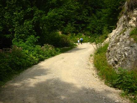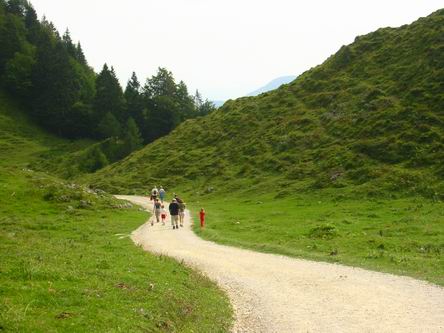 Ab dem Parkplatz fährt man am Nordufer des Hintersteiner Sees bis zu dessen Westende zum Gasthof Maier. Hier rechts über den Parkplatz auf die Straße zur Walleralm abbiegen. Der Weg ist nicht mehr zu verfehlen, da man bis zum Endpunkt einfach immer auf der Hauptstraße bleibt. Nach einem etwas steileren Anstieg wird es wieder flacher, anschließend moderat bis ins Gebiet der Walleralm. Hier für technisch versiertere Biker die Möglichkeit, rechts über den Fußweg einen kleinen Abkürzer zu fahren. Ansonsten bleibt man auf dem Hauptweg und hat bald die Almsiedlung erreicht.