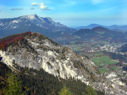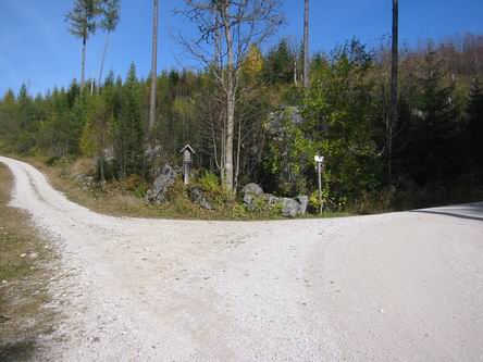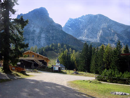 Am Großparkplatz Wimbachbrücke am besten auf dem kleinen Parkplatz parken, den man an dem großen Parkplatz vorbei über eine kleine Brücke erreicht. Hier beginnt die Auffahrt bei dem Hinweisschild "Kühroint 7" auf asphaltierter Straße. Die Straße führt sofort mit einer Linkskurve bergauf. nach wenigen Minuten ein schöner Blick auf das Hochkalter-Massiv (siehe Foto oben). Nun bleibt man immer auf dem Hauptweg, indem man sich an die Beschilderung "Kühroint" hält. Nach knapp fünf Kilometern verläßt man den Wald und erreicht das Gebiet der Schapbachalm. Weiter auf dem Hauptweg bleiben. In einer Linkskurve zweigt rechts der Geweg ins Watzmannkar ab. Nach einem schweißtreibenden Teilstück erreicht man eine Abzweigung (siehe Foto Nr. 2 - hier rechts fahren. Allerdings ist es wert, den Weg geradeaus in zwei Minuten hinaufzufahren und den Weitblick auf Grünberg und Schönau sowie Berchtesgaden zu genießen. Anschließend wieder hinunter zu dem Wegedreieck und links in Richtung Kührointalm, die man nach wenigen Minuten auf leicht ansteigendem Weg 50 Meter nach einem weiteren Wegedreieck erreicht.