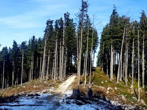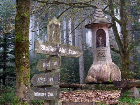 Wir fahren auf dem südöstlich verlaufenen Hauptweg bis zu der Linksserpentine und bleiben weiter auf dem Hauptweg. Ungefähr 2,5 km nach der Stoißeralm stoßen wir bei einem Holzdenkmal auf eine Wegegabelung (siehe Bild Nr. 2). Hier führt der linke Weg hinunter nach Anger, der rechte Richtung Adlgass. Die Forststraße ist bis nach Adlgass beschildert und nicht mehr zu verfehlen. Sie endet wenige Meter oberhalb unsers Ausgangspunktes.