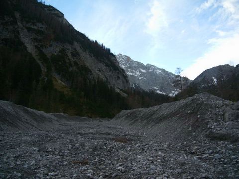 Direkt nach dem Parkplatz Bärenrast macht die Forststraße eine scharfe Serpentine. Hier wandern wir aber geradeaus, also nach Westen, weiter, die Forststraße bleibt den Radfahrern überlassen. Der Waldweg führt bald an einer Schlucht entlang, rechts geht es teilweise sehr steil durch den Bergwald in das Stallental bergab. Später zweigt von links eine Forststraße ein, es handelt sich um die vorweg genannte Straße für Mountainbiker. Bald darauf lichtet sich das Gelände und wir stehen am Rand der ebenen Hochfläche der Stallenalm. Die Almgebäude befinden sich am anderen Ende des Almgeländes und sind nicht sofort zu sehen. Die Stallenalm erreichen wir nach einer Gehzeit von insgesamt ca. 1 Std. 15 Min.
