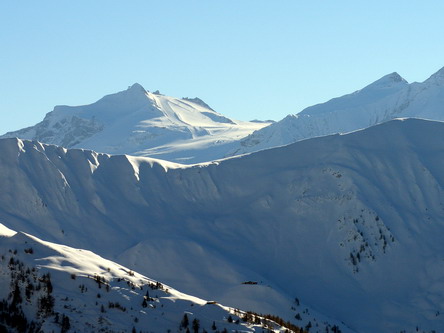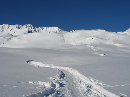 Die Abfahrt verläuft in den oberen Bereichen meist entlang der Aufstiegsroute: Vom Gipfel zurück in die Scharte, nun rechts halten und den schönen Hang hinunter und bis zum Parkplatz auf dem Aufstiegsweg.