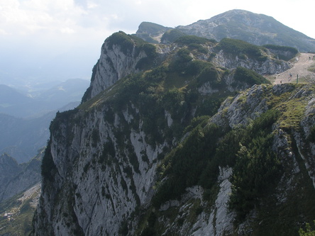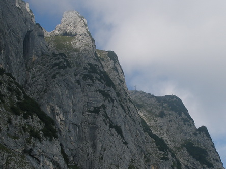 Über Leitern, Treppen und durch künstliche Felsgänge führt der Steig nun steil nach oben bis zur Mittagsscharte. Hier wendet man sich rechts und erreicht, nach einigem Auf und Ab durch Latschenfelder und Dolinen, den Gipfel des Salzburger Hochthron. Vom Gipfel aus gelangt man in einer Viertelstunde bergab zum Geiereck, wo sich die Bergstation der Untersbergbahn befindet. Dieses fährt in wenigen Minuten hinunter nach Grödig.