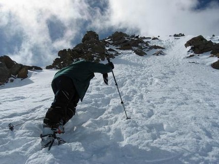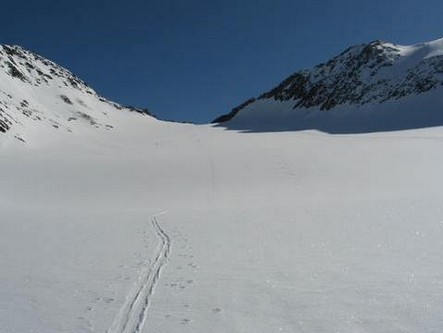 Nun unterhalb der Nordflanke des Zuckerhütls fast eben hinüber zum Pfaffensattel (3323 m). Jetzt an der Einsattelung zwischen Zuckerhütl und Wildem Pfaff noch ein Stück am Ostrücken mit Ski hinauf, bis es zu steil wird. Skidepot! Zu Fuß dann recht steil zum Gipfel. Bei guten Schneeverhältnissen und bei viel Schnee ist der Anstieg nicht schwierig. Pickel und Steigeisen können aber nicht schaden und beruhigen ungemein.