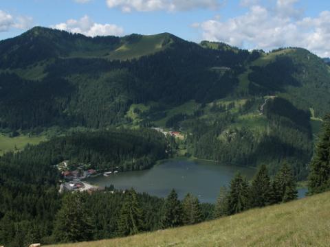 Ab dem nordöstlichen Eck des Parkplatzes folgen wir bergauf einem gut erkennbaren Steig (kein Wegweiser!), der uns nach wenigen Minuten über die Lochgrabenschneid links in einen Wald hinein führt. Es wird steiniger, und bald schimmert der Spitzingsee durch den lichten Wald hindurch. Wir erreichen am Ende des Waldes eine Almfläche, wo sich auch gleich der Weg gabelt. Hier halten wir uns links in Richtung "Jägerkamp Aiplspitz Schönfeldhütte".