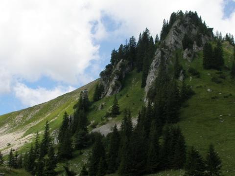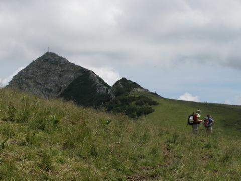 Nachdem wir die Schönfeldhütte erreicht haben, lassen wir diese rechts liegen und wandern unterhalb der "Wilden Fräulein" (siehe Foto) auf freien Wiesen hinüber zur Oberen Schönfeldalm. Hinter dieser führt uns der Steig in nordöstlicher Richtung hinauf bis auf den Sattel unterhalb der Benzingspitz. Hier wenden wir uns links und gehen bequem hinauf bis zum Gipfel des Jägerkamp.