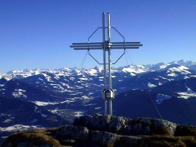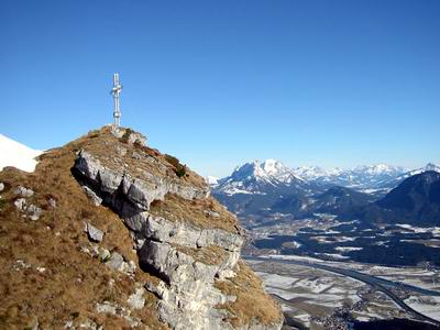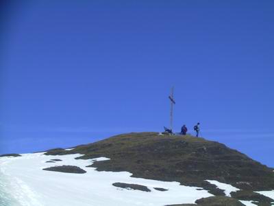 Hier geht es in nördlicher Richtung den Weg weiter in Richtung Eishöhle. Nach einigen Hundert Metern sieht man rechts oben auf einem baumlosen Grashügel ein Gipfelkreuz. Über diesen Gipfel hinwegsteigen und anschließend rechts auf einen Rücken hinauf. Dort erreicht man nach einigen Minuten eine große Hochfläche. Über diese hinweg, bis man plötzlich das Gipfelkreuz vor sich hat.