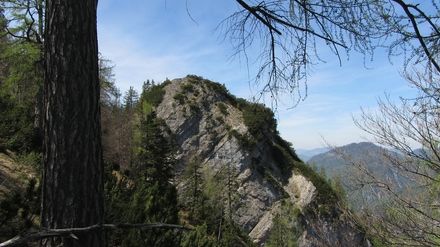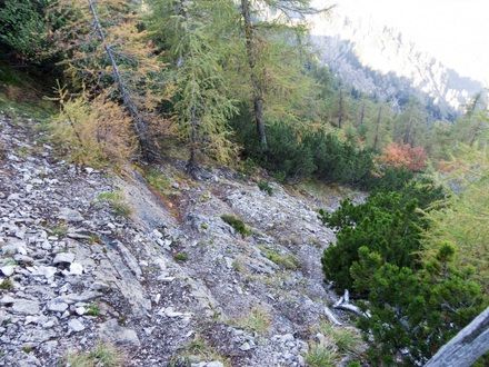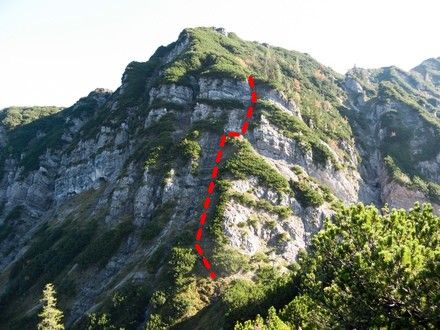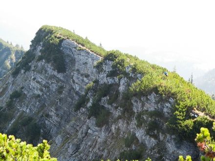 Von der Fahsteigenschneid steigen wir steil durch Latschen zur Schlüsselstelle der Tour, die wir leider nicht umgehen können, ab. Dort angekommen müssen wir ca. 30 m fast senkrecht abfallendes, rutschiges und brüchiges Gelände, das mit mehreren Stahlseilen gesichert ist hinabklettern (Einstufung: ohne Seil II / mit Seil B - B/C). Von dort geht es dann unschwer zum Brunstkopf.