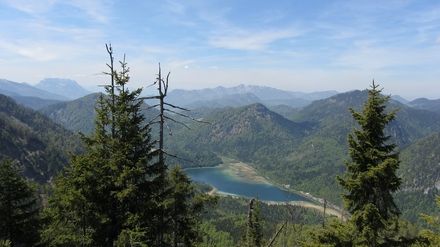 Nun wenden wir uns nach Norden in Richtung Richtstrichkopf. Der Weg ist oft nur schwer zu finden. Bei einigen Steinmännern beginnt der Abstiegsweg in westlicher Richtung. In unzähligen Serpentinen im steilen Gelände erfolgt der Abstieg bis zum Langen Hausgraben und dann weiter nach Norden zur Bundesstraße. Dort angekommen gehen wir auf einem Forstweg nach Westen zum Parkplatz Lödensee.