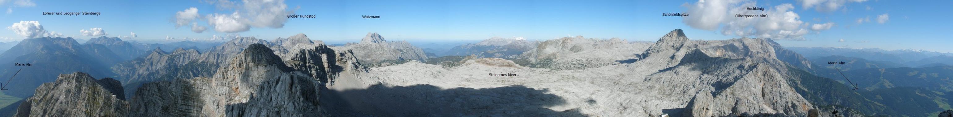 Vom Riemannhaus aus zweigen zwei Wege nach Norden ab. Wir folgen dem linken Weg, welcher bald nach Westen schwenkt und nach insgesamt 300 Metern in die Wege 428 und 401 gabelt. Wir folgen dem Weg Nr. 428 in Richtung «Breithorn» und «Saalfeldener Höhenweg». Durch Gestein und Felsblöcke schlängelt sich der Weg relativ einfach bis kurz vor den Gipfel, wo wir über einen schmalen Grat (Vorsicht!) das Gipfelkreuz erreichen. Erst vom Gipfel aus können wir das Steinerne Meer erst so richtig überblicken. Von links nach rechts grüßen über das karstige Hochplateau Hocheisspitze, Mitterhorn, Großer Hundstod, Watzmann, Hoher Göll und Schönfeldspitze zu uns herüber - um nur einige bekannte Gipfel beim Namen zu nennen. Hinter uns liegen die Steinberge und die Hohen Tauern.