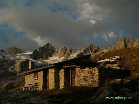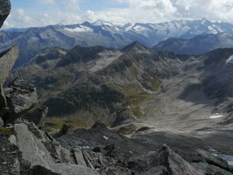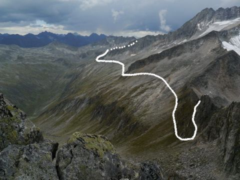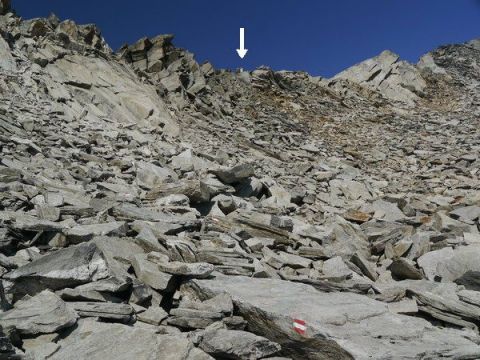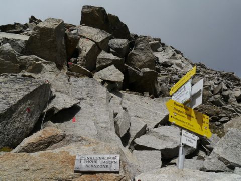 Vom Gipfel aus steigen wir wieder hinab zur Gamsscharte und wenden uns hier nach links. Mit Hilfe einiger Seilsicherungen gelangen wir auf ein steiles Schneefeld und folgen anschließend den Markierungen über ein riesiges Blockfeld. Da die Markierungen auf den Steinen hier eher selten sind, ist bei schlechter Sicht Orientierungssinn von Vorteil. Bei guter Sicht kann man man sich nicht verlaufen, denn die Richterhütte steht zwar noch weit entfernt, aber gut sichtbar unter uns am Talschluss des Rainbachtals. Nach dem Blockfeld gelangen wir in einem weiten Linksbogen unterhalb des Rainbachkees zur Richterhütte. Der Weg ist von weitem schon gut erkennbar.